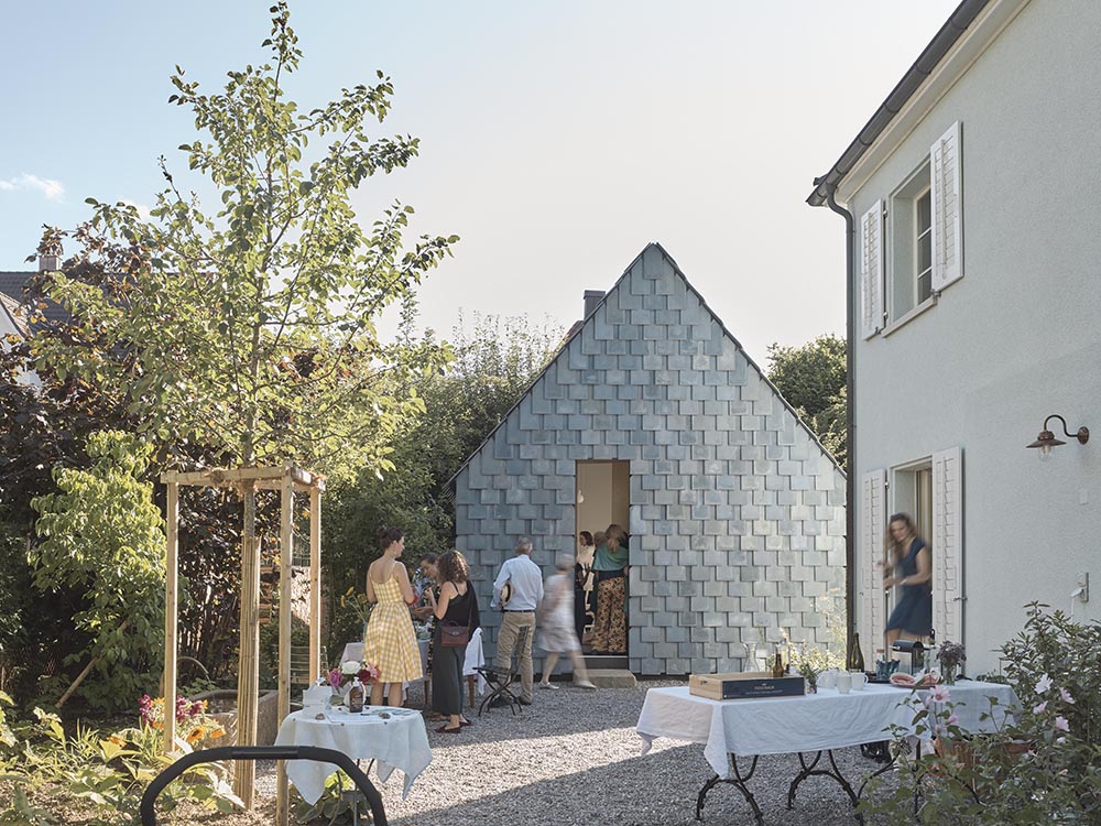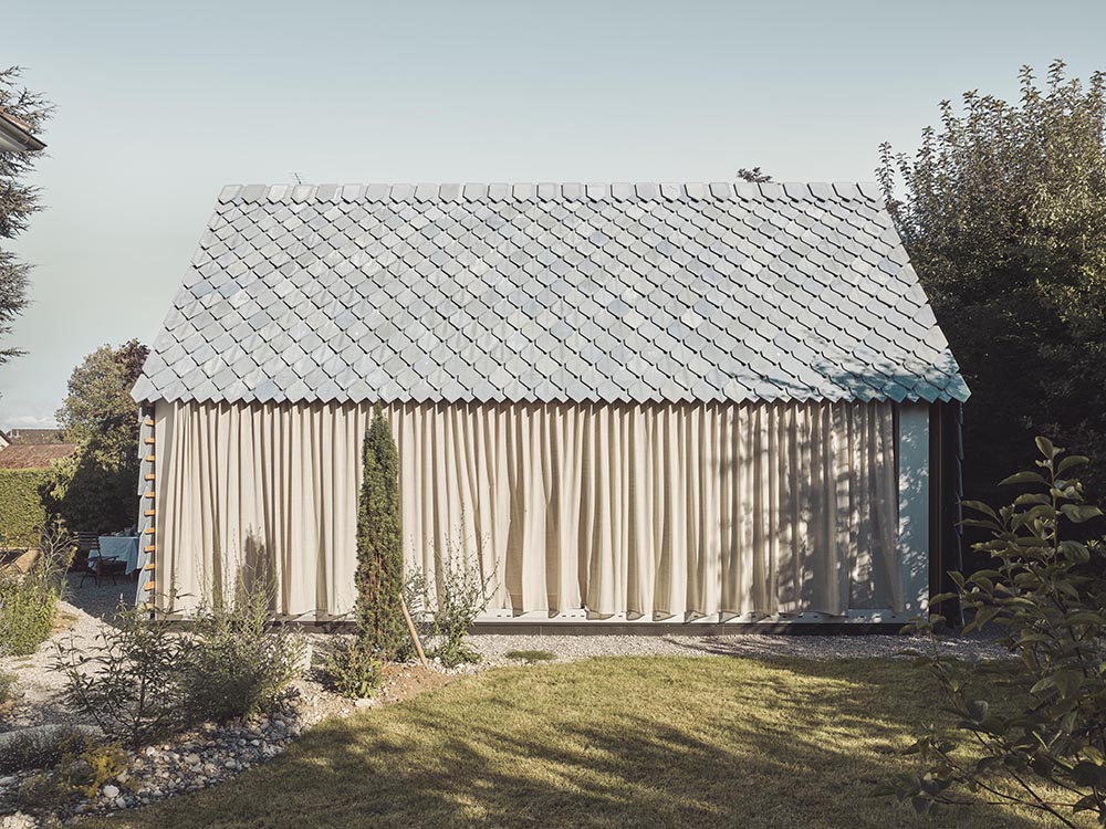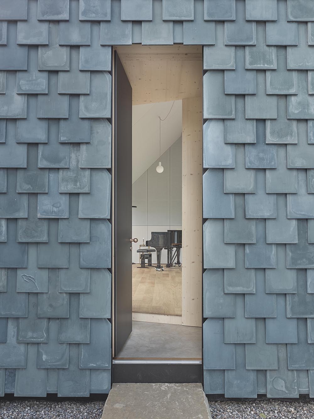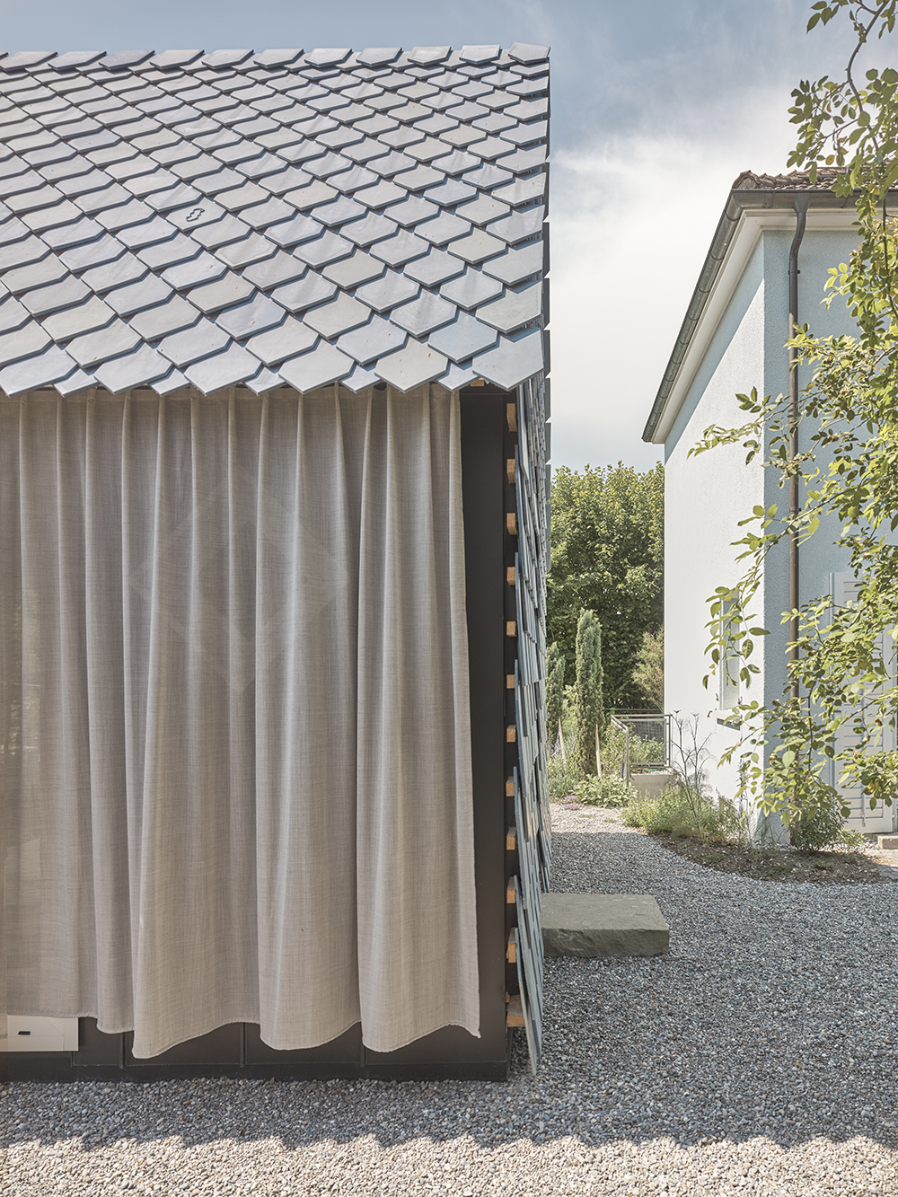 The music studio stands in a former workers’ quarter of Winterthur, shaped by gardens and gabled houses. A simple volume defines a sheltered courtyard and a wide garden. Towards the courtyard, the façade remains closed; towards the garden, a column-free glass front opens the space. Blue shimmering fibre-cement shingles, developed specially for the project, cover roof and gable alike. Their hand-crafted variations create a vibrant, abstract skin.