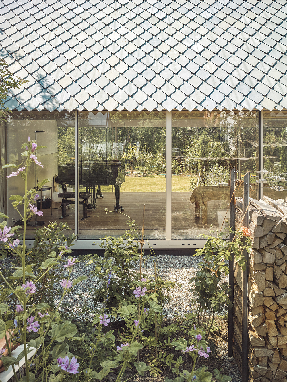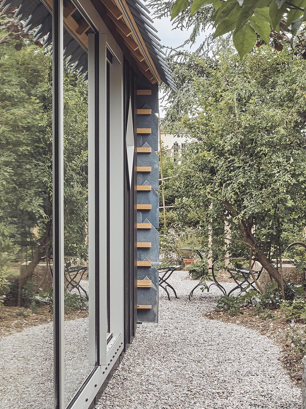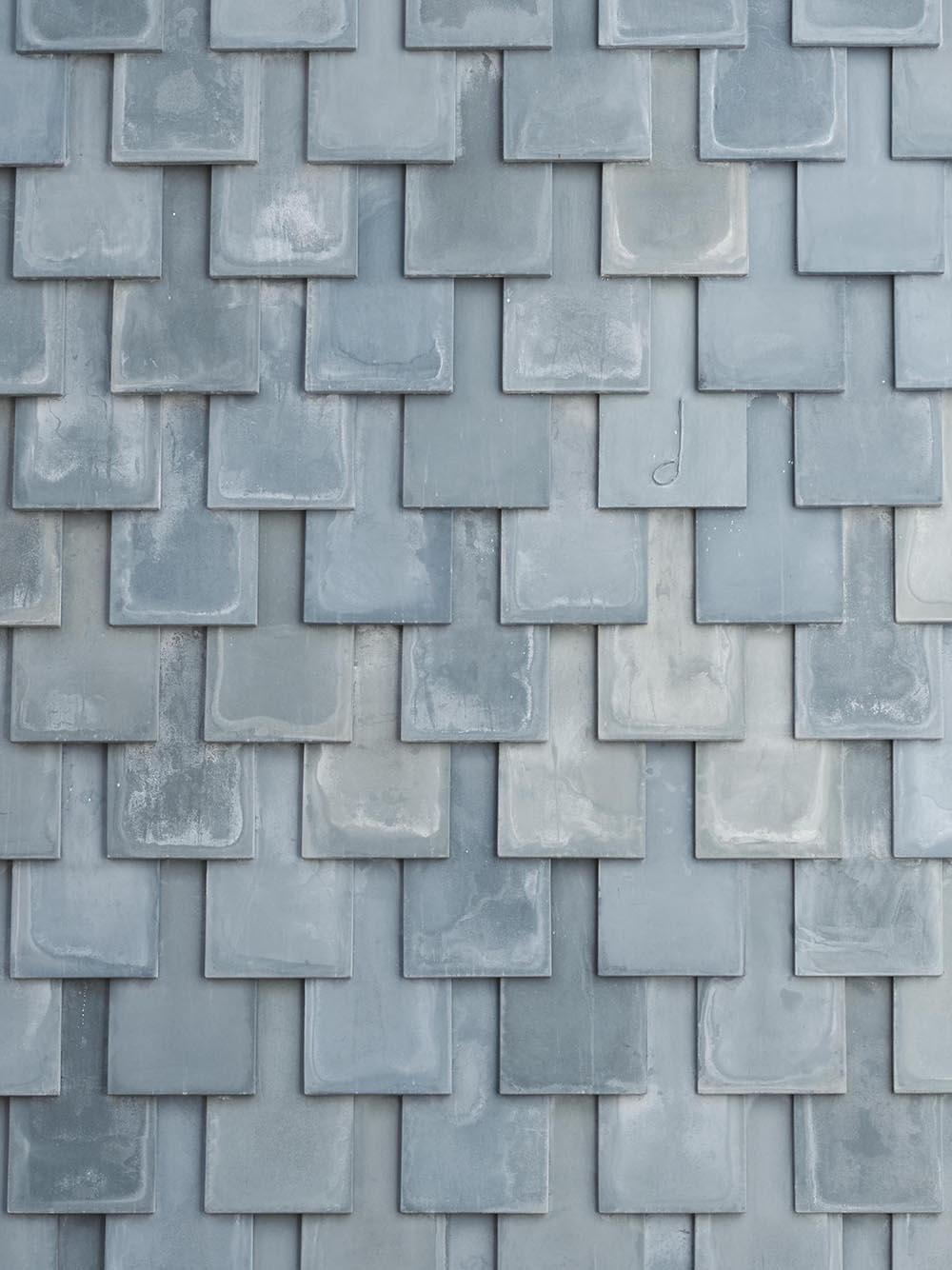 The music studio stands in a former workers’ quarter of Winterthur, shaped by gardens and gabled houses. A simple volume defines a sheltered courtyard and a wide garden. Towards the courtyard, the façade remains closed; towards the garden, a column-free glass front opens the space. Blue shimmering fibre-cement shingles, developed specially for the project, cover roof and gable alike. Their hand-crafted variations create a vibrant, abstract skin.