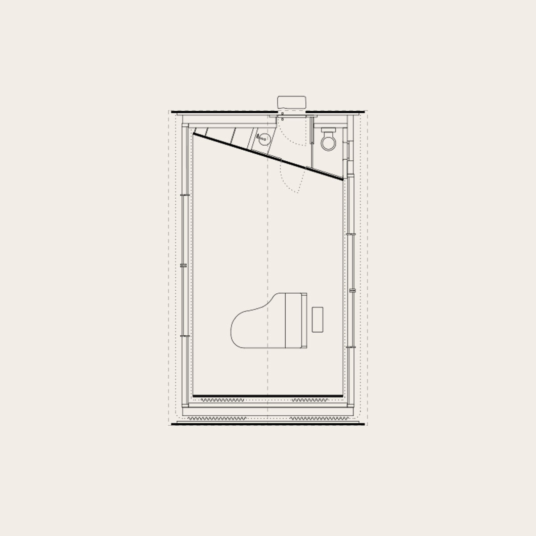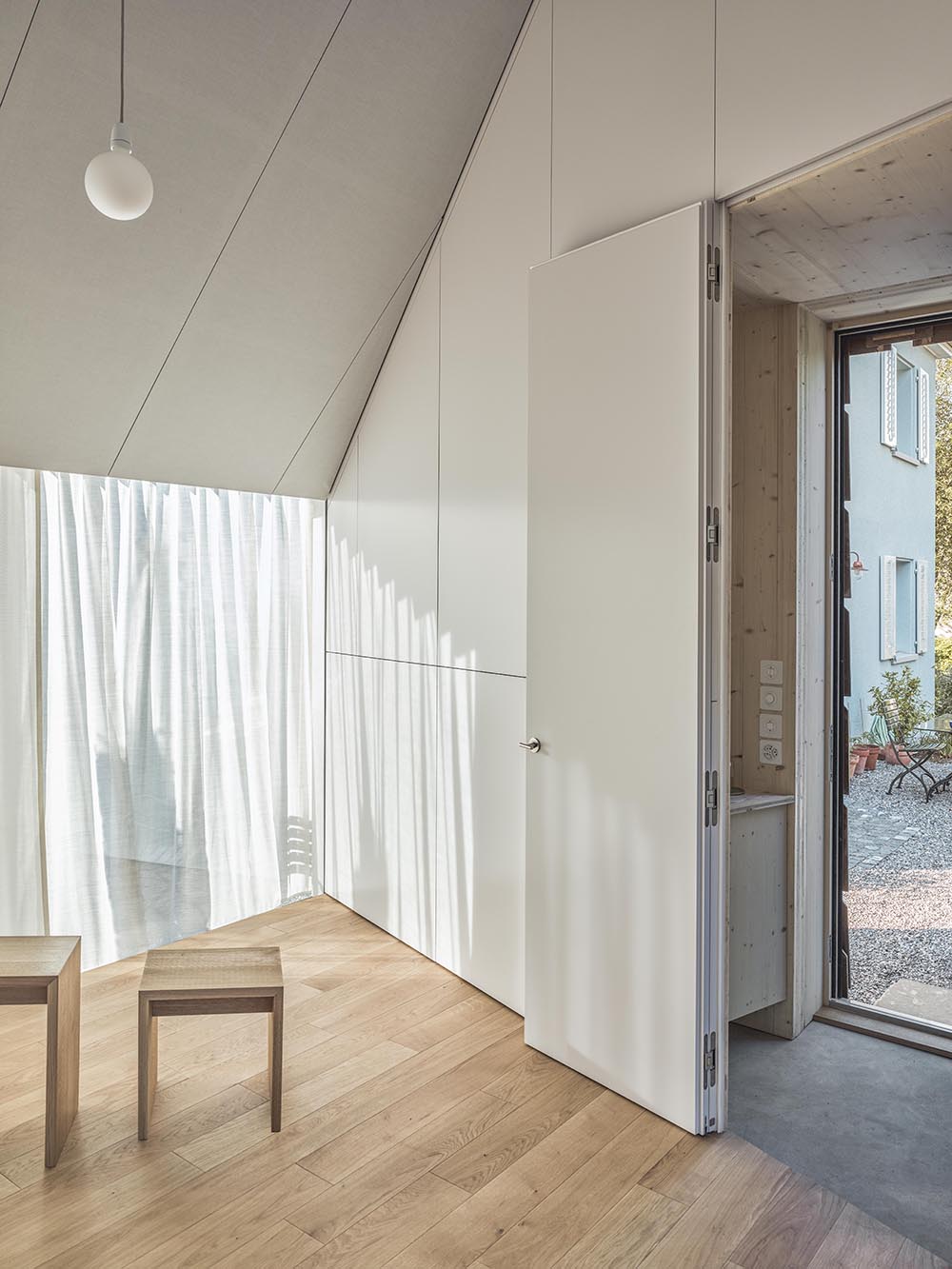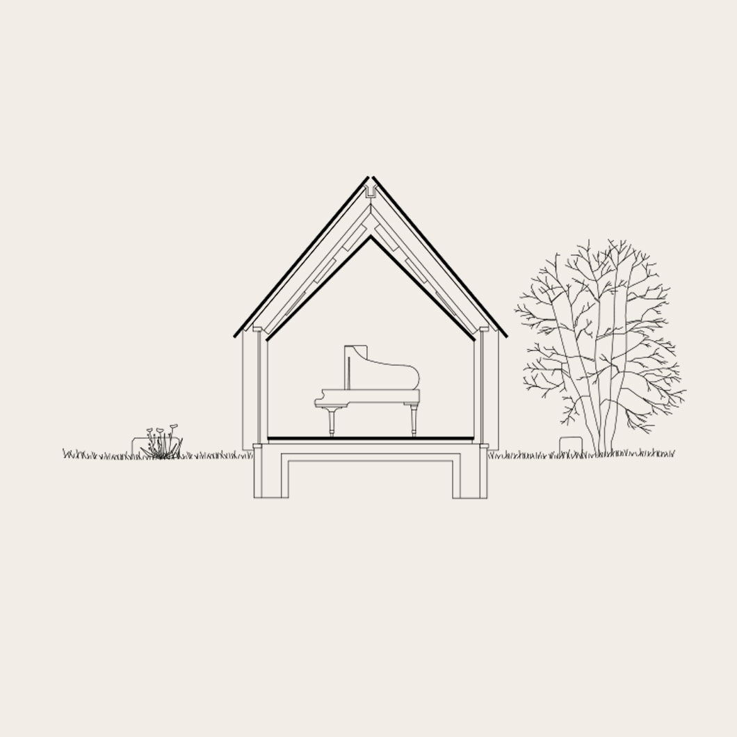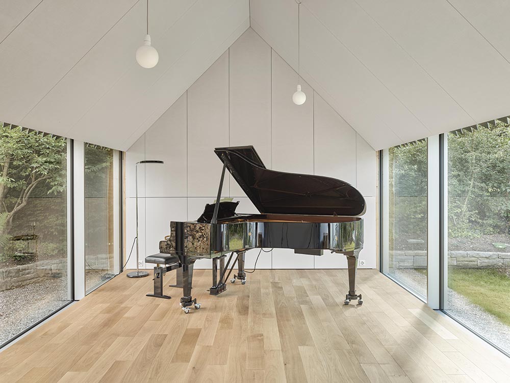 Inside, a modest sequence leads to the main room for a grand piano. A high gabled ceiling gives the space intimacy, while large openings connect it to the garden. White fabric panels line walls and ceiling, concealing precisely designed acoustic elements. The result is a calm and refined space where architecture, material and sound form a balanced whole.